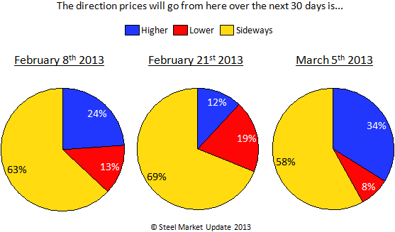 Steel Market Update did see a slight uptick in confidence in prices moving higher so far this week than when compared to the survey taken after the late January price announcements. At least a solid one-third of those responding to our survey feel that prices will move higher over the next 30 days.