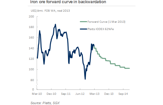 Rio Tinto, in its March 4 presentation to investors, predicted iron ore will fall to around $100/dry metric ton by September 2014.