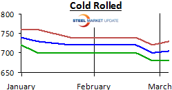 Hot Rolled Coil: SMU Range is $580-$630 per ton ($29.00/cwt-$31.50/cwt) with an average of $605 per ton ($30.25/cwt) fob mill, east of the Rockies. The lower end of our range remained the same as buyers took advantage of last minute deals while the upper end of our range increased by $10 per ton. Our average is $5 per ton higher than one week ago. The trend for hot rolled remains in Neutral as there continues to be excess supply in the market while at the same time scrap prices are rising. SMU believes there will be short-term price support as there was in January and then we will have to wait and see if supply continues to keep tapping on the brakes just as prices appear to be heading higher.