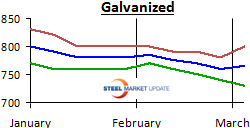 Galvanized Coil: SMU Base Price Range is $33.50/cwt-$37.00/cwt with an average of $35.25/cwt plus applicable extras, fob mill, east of the Rockies. SMU picked up a number of “deals” cut during the middle of this past week at the low end of our range (mostly on light gauge) and we saw our base drop by $10 per ton compared to one week ago. The upper end of our range rose by $20 per ton which brought our average up by $5 per ton. The trend for galvanized remains at Neutral as we wait to see if higher scrap prices will prompt buyers to buy 2nd Quarter needs resulting in some longer lead times. Time will tell.