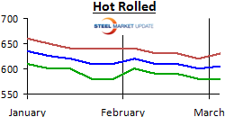 We heard from service center buyers a number of mills were looking for hot rolled business and the numbers from last week had hardly budged. The same manufacturing company quoted above told us, “We are seeing quoted prices up about $20, but most mills are willing to settle for the old price of $580-$600 for an immediate order. We are also seeing mills quoting out as long as 30-60 days at about $620.”