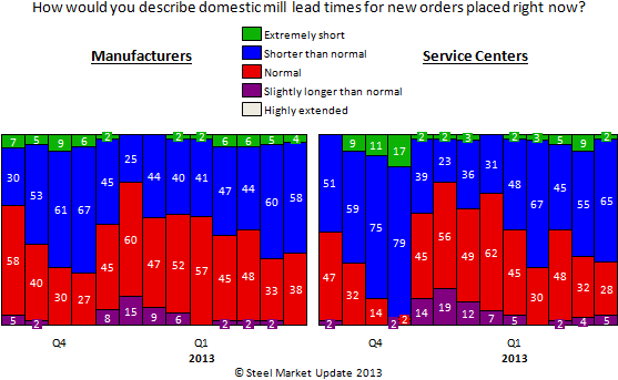 In order to provide a little better visual detail, SMU went back and took a look at our history regarding how the manufacturers and service centers viewed lead times as being “normal” or something other than normal. What you see in our graphic is both manufacturing companies and service centers are referencing lead times where “normal” is being pushed lower and the majority of buyers are reporting lead times as shorter than normal or extremely short. In this graphic you can clearly see the difference between early 4th Quarter 2012 when the mills were able to gather a small bump in prices to where we are in 1st Quarter which has not been able to gain any price traction to speak of.
