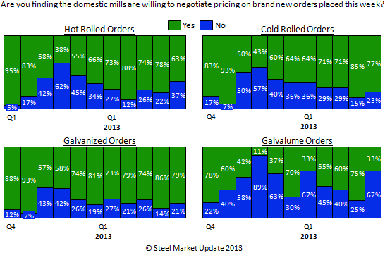 Usually, one week after a price increase announcement is made; you expect to see price flexibility in negotiations between the steel mills and their customers’ contract. The only area where we did see a large movement away from price flexibility was in Galvalume. All of the other items remained well over 60 percent with cold rolled and galvanized at 77 percent and 79 percent respectively.