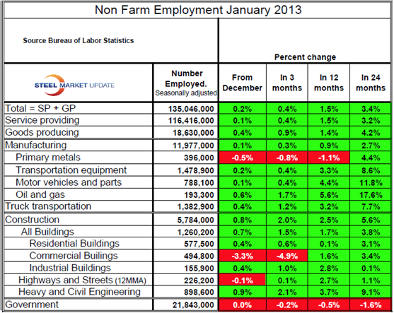 Net job creation in January exceeded expectations with a headline value of 236,000. Built into this number is data that can validate, (or not) other statistics of interest to steel producers and processors. The big picture is 1,966,000 jobs have been created in the last 12 months and we are tracking to have a full recovery in employment by July next year.