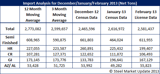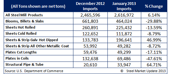 The U.S. Department of Commerce has released final January import data (Census Data) and Preliminary License data for the month of February 2013. January imports grew by 6 percent over the previous month. When looking at the data closer SMU notes – only two products (of those we follow closely) were significantly higher than the prior month – galvanized and structural pipe and tube. All of the other items – slabs, hot rolled, cold rolled, Galvalume and plates in both cut length and coils – were lower.