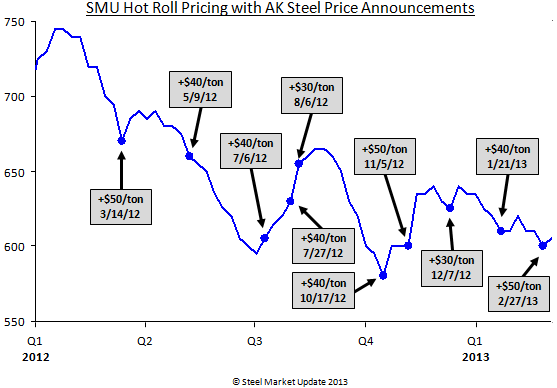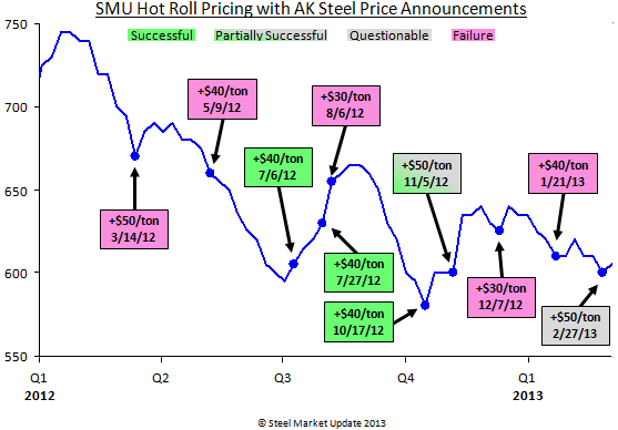 As you can see by our graph, the most recent price announcements going back to November 5, 2012 have created a very jagged visual as the announcements appear to create short term volatility. However, from the mill view point the announcements have stopped the indexes (which are an average, not the bottom) from breaking through the $600 per ton level. If the intent is to put a temporary bottom to the market, and that is your measure of success, then the domestic mills have been more successful than our graphic suggests.