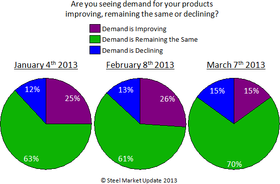 Based on the results from this past week’s steel survey, demand remains relatively stable with 70 percent of our respondents (all companies) reporting demand as “remaining the same.” The number of companies reporting demand as “improving” dropped from the low to mid 20 percent range down to 15 percent. Those reporting demand as “declining” increased to 15 percent.
