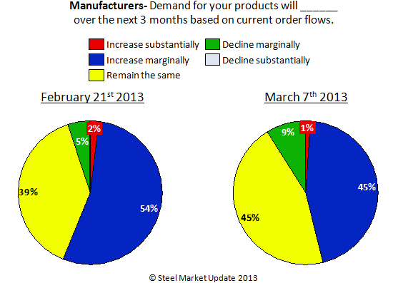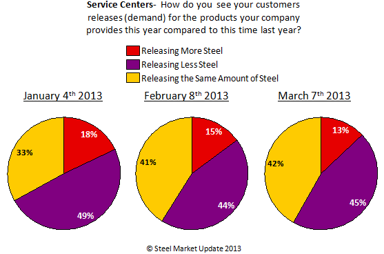 We then broke out the service centers and manufacturing companies into separate surveys and asked each about demand within their segment of the flat rolled steel industry. Service centers have remained pretty consistent over the past few months with 45 percent reporting their customers as releasing less steel than this time last year and an almost equal amount (this past week 42 percent) reporting they were releasing the same amount of steel. Only 13 percent of the distributors responding to our survey reported their customers as releasing more steel than the previous year.
