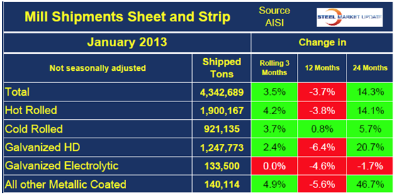 Sheet steel shipments in January were 4,343,000 tons, an increase of 322,000 tons over December’s volume. These figures are shipments to domestic locations plus exports based on the AISI AIS10 and Commerce Department trade reports.