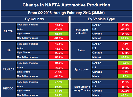 Vehicle manufacture in NAFTA began to decline a year and a half before the recession officially hit in Q1 2008. The table below shows the growth/contraction by country of final assembly on the left and by vehicle type on the right since the recent peak in Q2 2006. The result is a stunning revelation of how assembly has moved preferentially to Mexico since Q2 2006. Light vehicle assemblies in Mexico are up by 37.7 percent in this time period as the US and Canada are down by 17.5 percent and 21.6 percent respectively. The contrast is even more striking for medium and heavy trucks where Canada has been almost shut out of any growth in the last seven years. Mexico was up by 68.5 percent, US down by 39.7 percent and Canada down by 84.3 percent.
