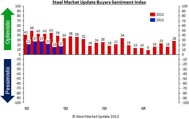 Based on the results from the Steel Market Update (SMU) steel survey which began on Monday and concluded earlier today, the SMU Steel Buyers Sentiment Index remained mildly optimistic and was measured at +17. This is a 2 point improvement over the +15 reported at the beginning of March. The +17 recorded for the middle of March is 22 points less than the +39 recorded one year ago. The +17 is also 10 points below the highest reading so far this year which was recorded during the middle of January and early February 2013. Any reading above +10 is considered to be within the optimistic range of our Index.