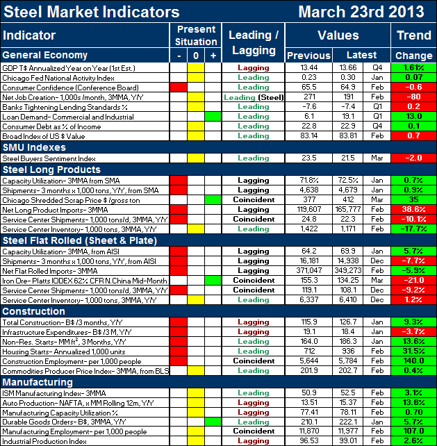 The total number of indicators considered at present is 33. On March 23rd, the present situation of four of the indicators was positive and fourteen were negative. This means that by historical standards the steel market is still not great. No surprise there. However looking at the distribution of leading, coincident and lagging indicators is encouraging. Of the 14 negative present situation indicators, eight were lagging. Only three of the fifteen leading indicators were red. This overall trend is confirmed by a quantitative analysis of the value of each indicator over time and is shown in the “Trend” column. In this case twenty one indicators were trending positive and twelve were trending negative. Five of the six construction indicators, led by the private sector are now trending positive. Only infrastructure is trending negative. All of the manufacturing indicators are trending positive.