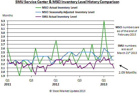 Based on the results from our steel survey conducted this past week, service center inventories dropped to 2.09 months and have been declining over the past couple of months. Steel Market Update does not weigh larger service center results any differently than smaller service centers. We defer to the MSCI data as being more complete. However, we believe our survey will provide an early look at what you might expect to see in the next MSCI report. In the graph below, the MSCI data is based on inventories at the end of February. Our data is as of the week of March 18th.