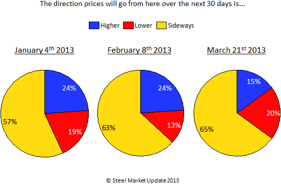 The domestic steel mills feel differently than the overall steel market (all groups combined). In a separate question asked only of the steel mills responding to our survey 80 percent believed prices would move higher from here with 20 percent believing they will move sideways over the next 30 days. This is a change from our last survey when 100 percent of the mills reported prices would move higher from that point in time.