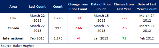 According to Baker Hughes data from March 22nd, 2013, the U.S rig count for this week is 1,746 rigs exploring for or developing oil or natural gas. This number represents a decrease of 30 rigs from last week. Compared to last year the 1,746 count is a decrease of 222 rigs. Canadian rigs decreased by 166 to 337 rigs this week, a decrease of 15 rigs from a year ago. International rigs decreased by 4 to 1,275 rigs last month, an increase of 71 rigs from a year ago.