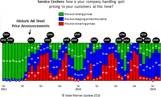 One of the problems, as we see it, is the lack of support by the domestic service centers for pushing spot prices higher. As you can see by the graph, the highest level of support service centers reported for their spot pricing was 56 percent in mid-November and then it dropped from there. After the recent announcement the support level is 27 percent. We have not had a successful price announcement in the past two years with that kind of service center support.