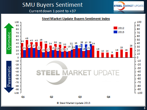 Steel Market Update (SMU) Steel Buyers Sentiment Index was measured at +38 based on the results of our mid-August review of the flat rolled steel market. Sentiment continues to be at the peak of optimism displayed during calendar year 2013. Buyers and sellers of flat rolled steel continue to respond in a positive fashion to the increase in mill spot pricing. The industry is