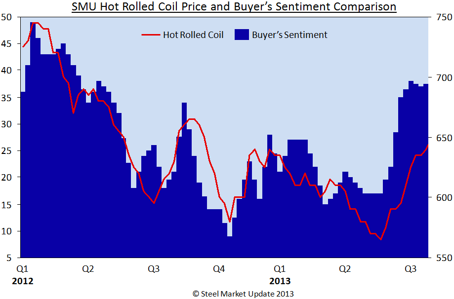 Historically, Steel Market Update has found Sentiment improves as flat rolled steel prices rise. The graphic provided shows the relationship between benchmark hot rolled pricing and SMU Steel Buyers Sentiment Index.