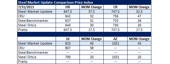 The first point to notice is that all of the indices have the same basic HR benchmark: Prime mild carbon HR coils 48”-60” width, CSB, no extras. This is based off the ASTM A 1011-06a Commercial Type B standards.