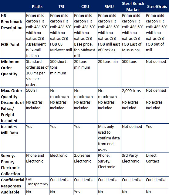 As we undertook our investigation, SMU found that after the initial description of the benchmark hot rolled product – very little else was the same from index to index. Review the table below and then we will provide a short analysis on the other side.