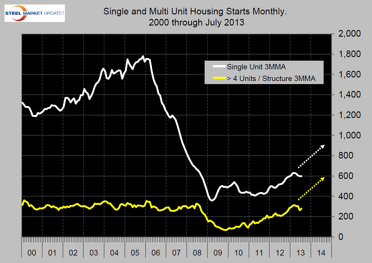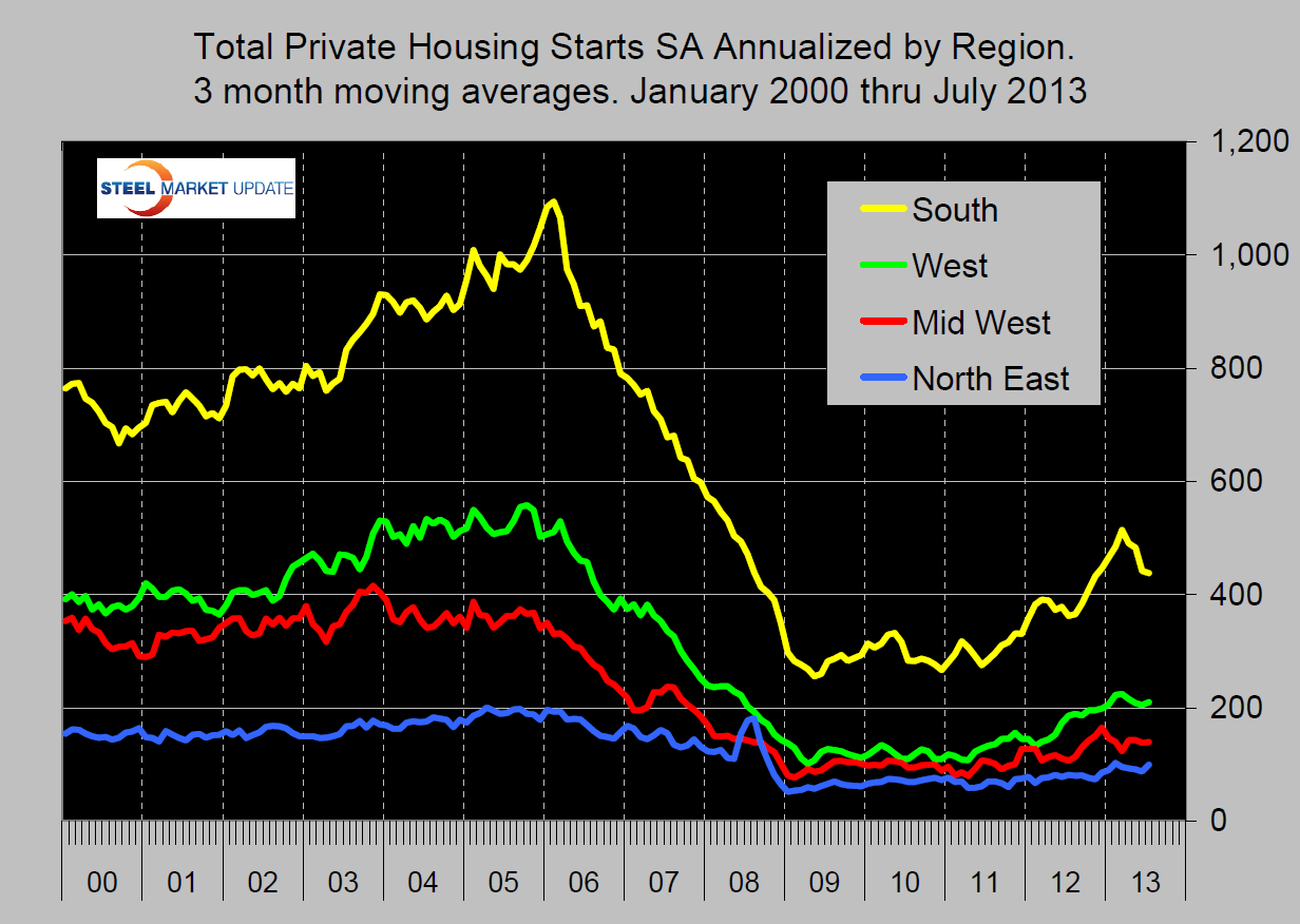 As reported by Sandy Williams here in the Steel Market Update on Friday, the National Association of Home Builders index reached its highest level in almost eight years in July but the Census Bureau construction starts data is not so encouraging. On a year over year basis the 3-month moving average (3MMA) of both permits and starts are still growing strongly at 17.1 percent and 20.5 percent respectively but growth has slowed compared to last year and on a monthly basis the growth of total starts has been negative for three of the last four months.
