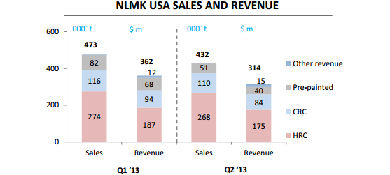 NLMK reported USA revenue of $314 million in the second quarter down from $362 million in Q1. The company noted lower demand from the US construction sector and general deterioration of market conditions in Europe and the USA along with industry oversupply.