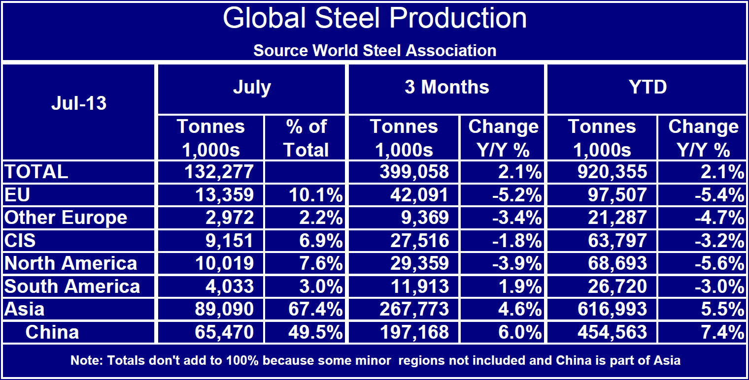 The three month moving average of global production in July was unchanged from June at an annual rate of 1.596 billion tons. Capacity utilization was 77.5 percent (Figure 1). For the July data, the World Steel Association increased the global capacity to 2.06 billion tons which reduced the capacity utilization value back to Q3 last year. Year to date global production through July was up by 2.1 percent from 2012. All regions declined except Asia which increased by 5.5 percent. All the reporting nations in Asia increased except South Korea which was down by 5.3 percent. China was up by 7.4 percent (Table 1). This is a continuation of recent trends with no surprises. China now accounts for 49.4 percent of global steel production which intuitively seems unsustainable.