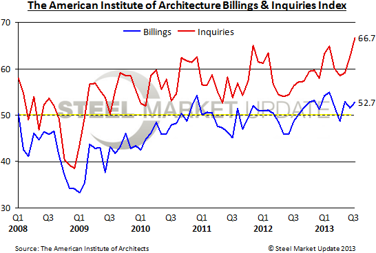 The Architecture Billings Index jumped to 52.7 in July from 51.6 in June indicating a growing demand for construction design activity. The new project inquiry index, an indicator for future demand, surged 4.1 points to 66.7 in July.
