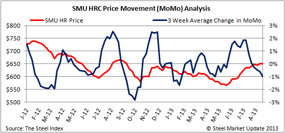 MoMo was measured at 3.83 percent this week, down from 4.87 percent last week. The 3-week average change in MoMo is -0.98 percent, a decline for the 8th consecutive week. The graph below demonstrates the relationship between the SMU hot rolled coil price and the three week moving average change in MoMo. Our HRC price range for this week is $630/ton to $670/ton with an average price of $650/ton.