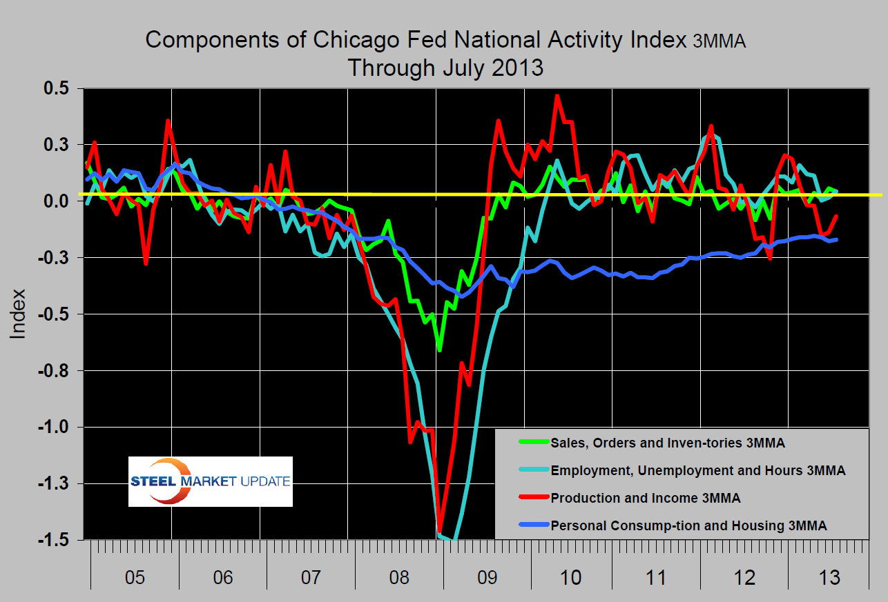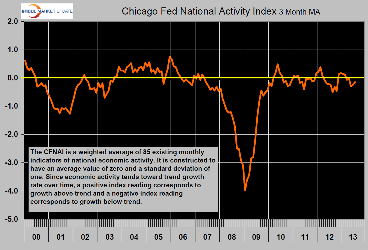 The following is an abridged version of the Chicago Federal Reserve statement plus graphical analysis by Steel Market Update. The index is a weighted average of 85 indicators of national economic activity drawn from four broad categories of data: 1) production and income; 2) employment, unemployment, and hours; 3) personal consumption and housing; and 4) sales, orders, and inventories. A zero value for the index indicates that the national economy is expanding at its historical trend rate of growth; negative values indicate below-average growth; and positive values indicate above-average growth.