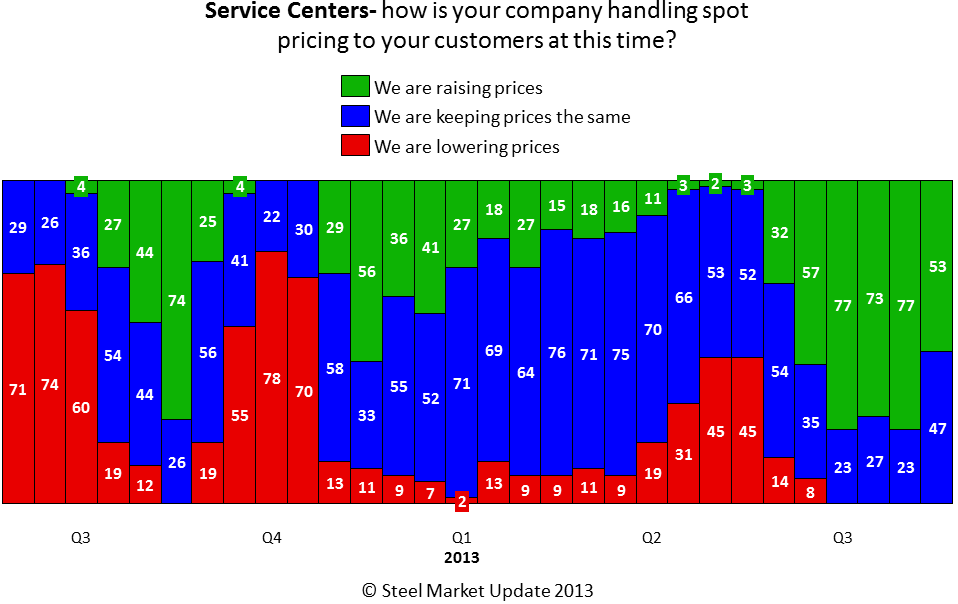 The percentage of service centers raising spot flat rolled steel prices dropped according to our most recent analysis of the flat rolled steel market. With flat rolled price ranges and averages stagnating at relatively high levels (compared to the lows for the year) distributors’ pricing appears to be leveling off as well. The service center spot markets continue to be highly competitive and are one of the key factors watched by SMU as we analyze whether prices will rise, fall or remain the same from here.