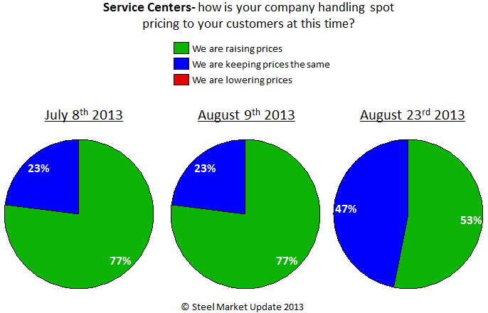 Manufacturing companies also noted that a cyclical peak may have occurred at the beginning of August and now prices appear to be treading sideways and the percentage of service centers asking for higher spot pricing has begun to shrink. The percentage of distributors asking for price increases went from 52 percent at the beginning of August to 41 percent this past week. The majority (52 percent) of the manufacturing companies indicated spot price offers as being the same as what was seen at the beginning of the month. A number of manufacturing companies pointed out in the comment section of our survey that they were not in the market for spot tons. One end user told us, “We are not seeing any change because we are not in the market. I would imagine that unless a steel buyer has been in a cave for the last three months, they are not buying either.” While a second one commented with, “If we did have the balance of the year covered already and I had to purchase today my price would be up about $3.00/cwt. Glad I am not buying.”