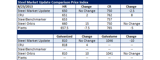 We got a taste of everything this past week from the various steel indexes we monitor on a regular basis. Platts, which recently has been on the leading edge of higher flat rolled steel prices, scaled their numbers back on both hot rolled and cold rolled this week. CRU budged ever so slightly higher on hot rolled (+$2), cold rolled (+$8) and galvanized (+$4). Steel Orbis, which is normally the lowest priced index on our totem pole, moved their hot rolled number up $15 and galvanized up $10 – on cold rolled and Galvalume they remained where they were. SteelBenchmarker was not in the game last week as they only produce their numbers twice per month.