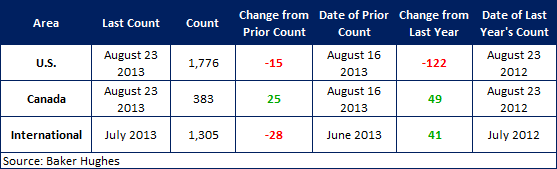 According to Baker Hughes data from August 23rd, 2013, the U.S rig count for this week is 1,776 rigs exploring for or developing oil or natural gas. This number represents a decrease of 15 rigs compared to last week, with oil rigs down 15 to 1,382 rigs, gas rigs down 1 to 387 rigs, and miscellaneous rigs up 1 to 7 rigs. Compared to last year the 1,776 count is a decrease of 122 rigs, with oil rigs down by 26, gas rigs down by 99, and miscellaneous rigs up by 3.