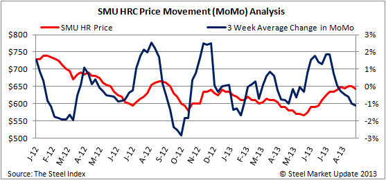 MoMo was measured at 1.92 percent this week, down from 3.83 percent last week. The 3-week average change in MoMo is -1.12 percent, a decline for the 9th consecutive week. The graph below demonstrates the relationship between the SMU hot rolled coil price and the three week moving average change in MoMo. Our HRC price range for this week is $625/ton to $660/ton with an average price of $642.5/ton.