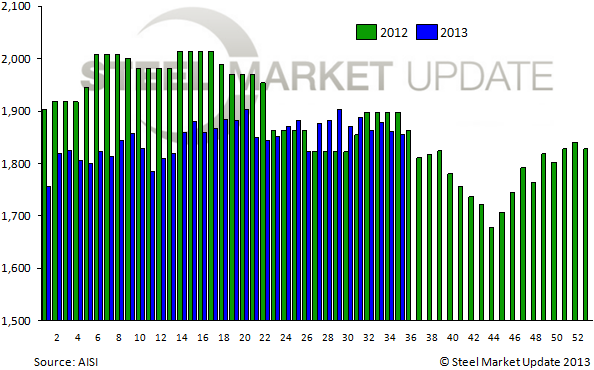 The American Iron & Steel Institute (AISI) reported estimated raw steel production at 1,871,000 net tons for the week ending July 27, 2013. With outages and maintenance issues, production declined through August to a high of 1,888,000 net tons of raw steel in the week ending August 3, and dropping down to 1,856,000 net tons in the final week of the month, ending on August 31.