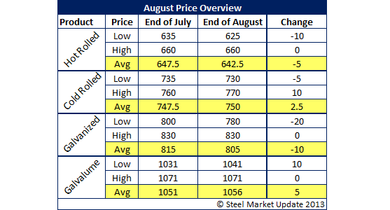 The month of August saw flat rolled prices as “flat” from the beginning to the end of the month. The good news for the domestic steel mills was that pricing did not crumple during the month. Our hot rolled average went from $645 up to $650 and then ended the month at the lowest level seen since July 23rd when we posted $642.50 per ton.