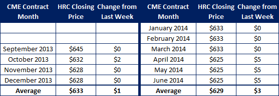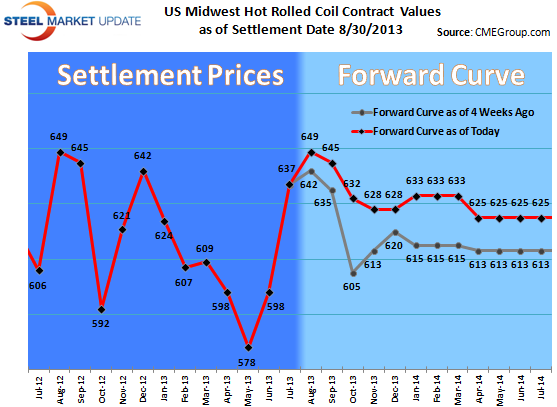 Below is the forward curve for hot rolled coil (HRC) futures as of the end of August. We have provided the information in both a table and graph format. Our graph also shows where the forward curve was four weeks earlier.