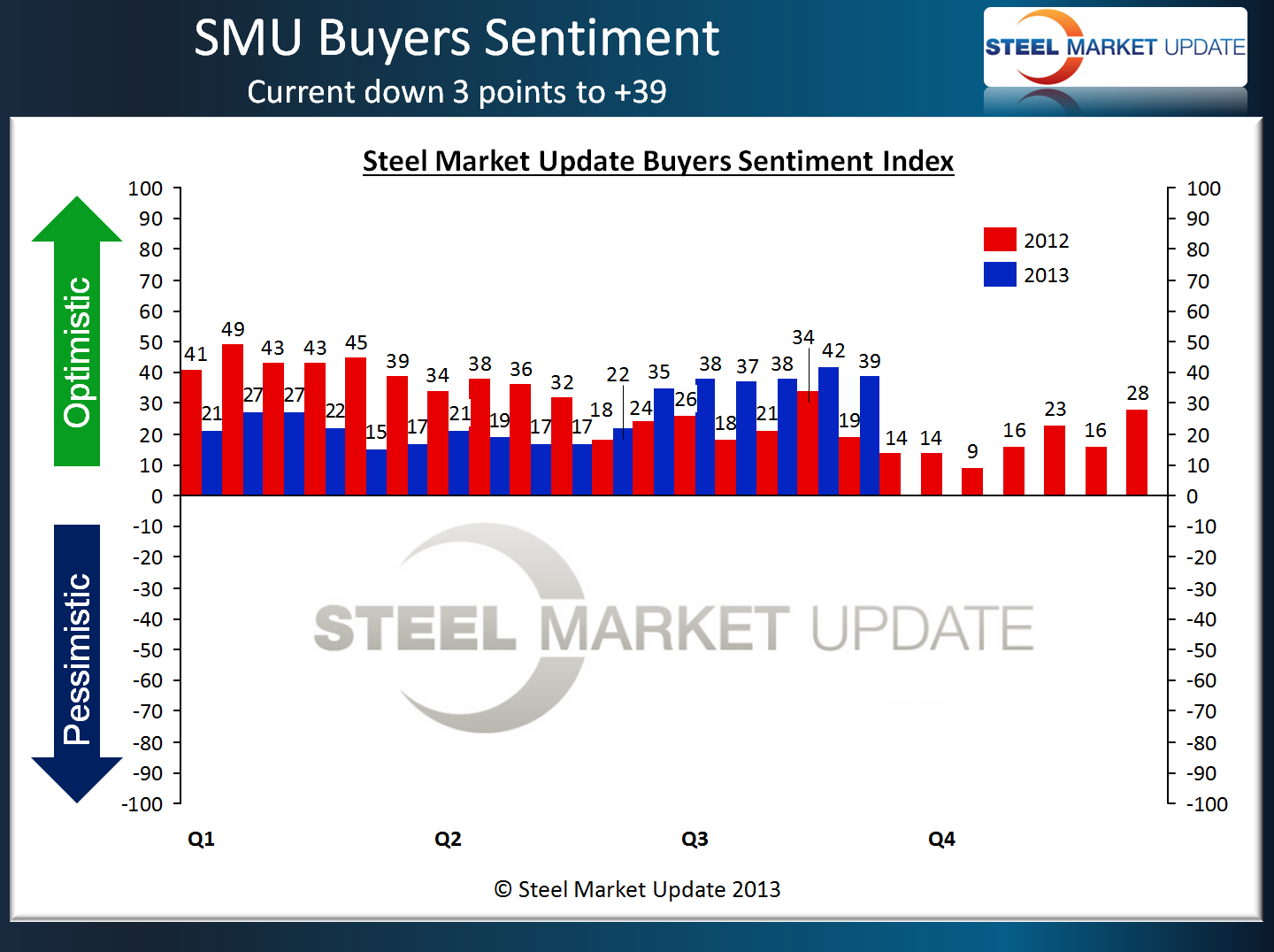 Steel Market Update (SMU) Steel Buyers Sentiment Index was measured earlier today at +40, down 3 points from the middle of August and well within the optimistic range for the index. Compared to one year ago buyers and sellers of flat rolled steel are feeling much better about their company’s ability to be successful in today’s market. Last September the SMU Steel Buyers Sentiment Index was measured at +19 and then dropped to a low point of +9 during the middle of October 2012. Since the end of May 2013, Sentiment has been trending higher indicating steel buyers and sellers continue to grow even more optimistic about their company’s ability to be successful in the current market environment.