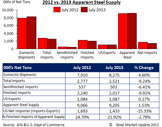 Apparent steel supply for July was up slightly compared to the same month one year ago by 1.53 percent. This is due to a 4.60 percent increase in domestic shipments, which was offset by a decrease in both total steel imports and finished steel imports, down 9.24 percent and 9.92 percent respectively. The net trade from imports versus steel exports was a surplus of 1,433,000 net tons of imports in July of this year, a decrease of 15.33 percent from one year prior.