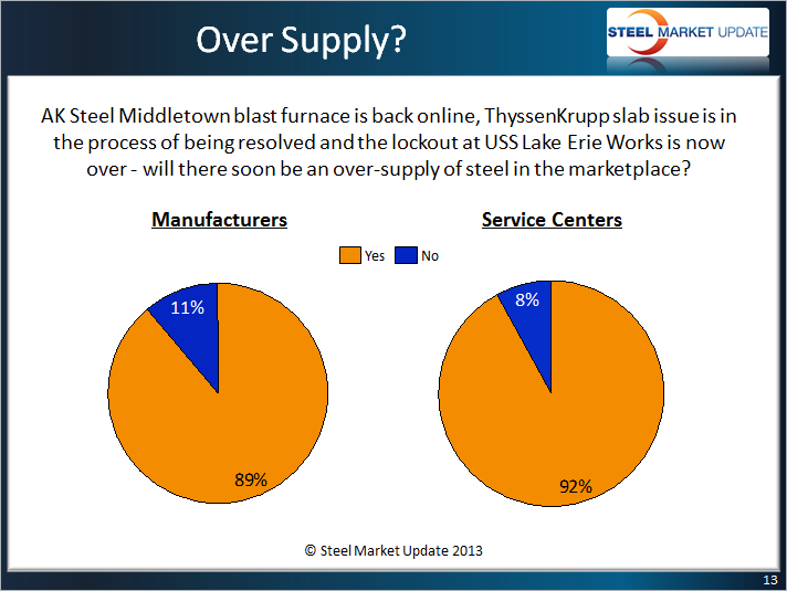 By wide margins, our respondents believe that the flat rolled steel market will be in over-supply due to the return of the Middletown blast furnace, the resolution of the ThyssenKrupp slab issues and the union returning to work at Lake Erie Works. When our question was put to manufacturing companies and services centers independently the results were the same. Close to 90 percent of service centers and over 90 percent of manufacturing companies believe there will soon be an over-supply of steel.