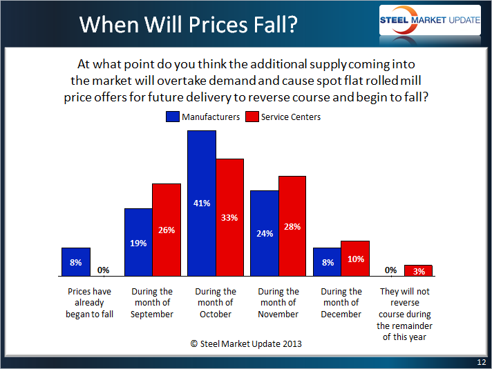 So the question becomes at what point will spot prices begin to be impacted by the return of supply to the marketplace? Twenty seven percent of the manufacturing companies believe prices have either already begun to decline (8 percent) or will during the month of September (19 percent). Service centers did not pick up on declining prices prior to September as their first response was 26 percent during the current month.