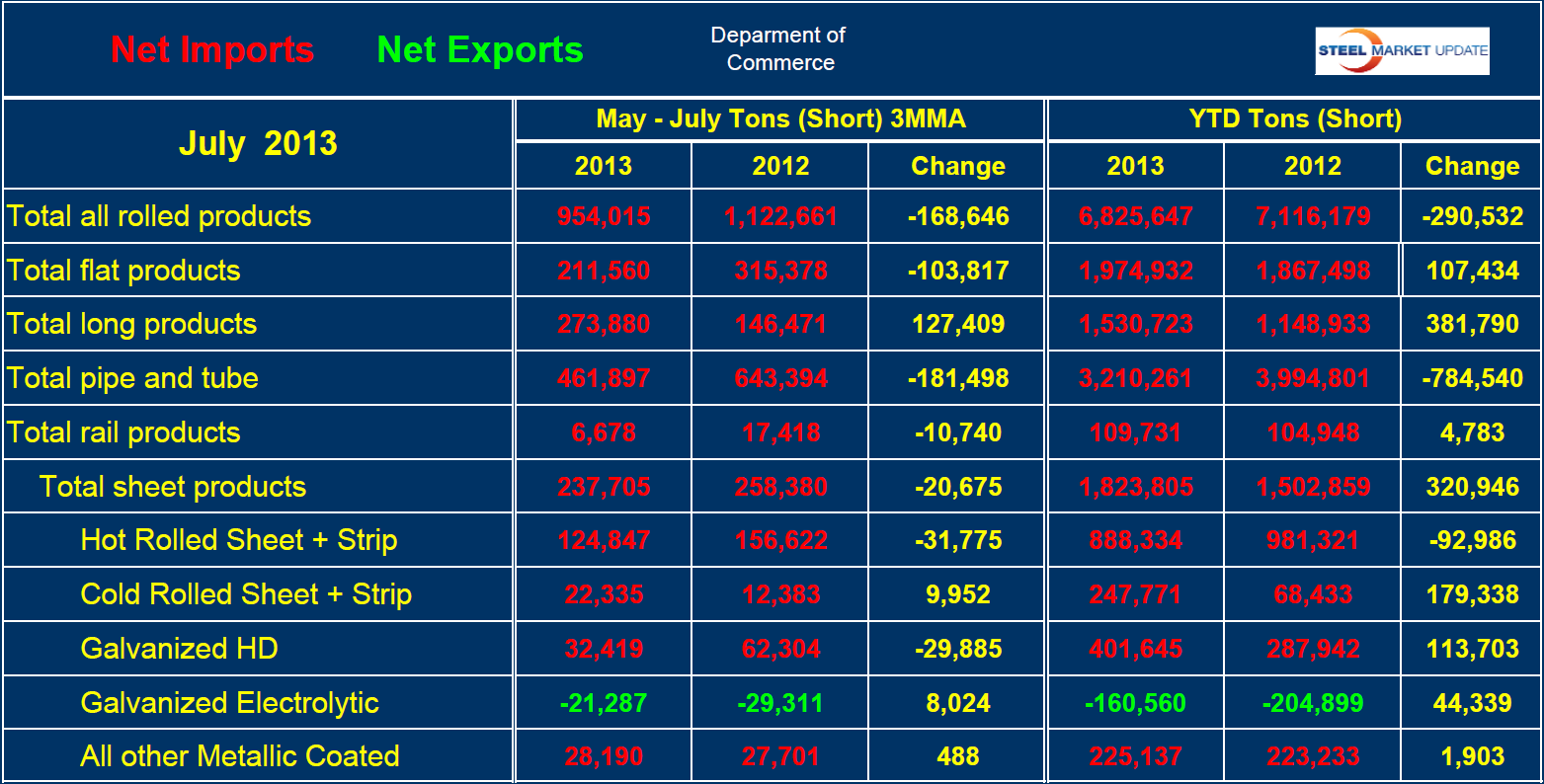 Table 1 compares the periods May through July and YTD for 2013 and 2012. Electro galvanized is the only product to have consistently had negative net imports, meaning that exports exceeded imports.