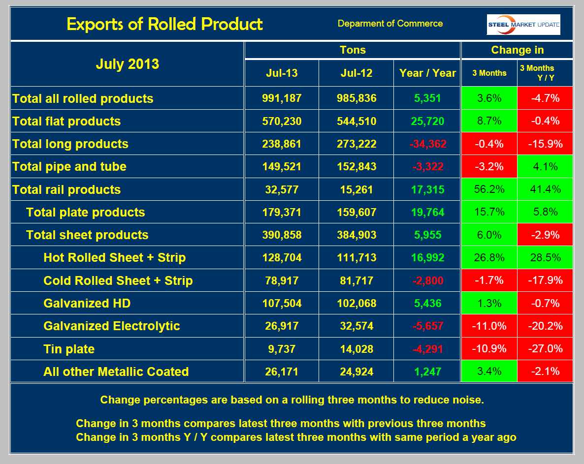 In July 2013, total hot worked steel exports were up by 5,351 tons compared to July 2012. Flat rolled products in total were up by 25,720 tons and long products were down by 34,362 tons. Rail, plate and hot rolled sheet and strip all experienced an increase in export volume in July 2013 compared to July 2012. Table 2 shows the change by product in tons comparing July 2013 and July 2012. It also compares the percent change in the three month periods May through July 2012 and 2013 and in-order to identify the short term change it compares May through July 2013 with February through April 2013. In the sheet market hot rolled exports are up by 28.5 percent in three months through July year over year as all other sheet product exports declined.