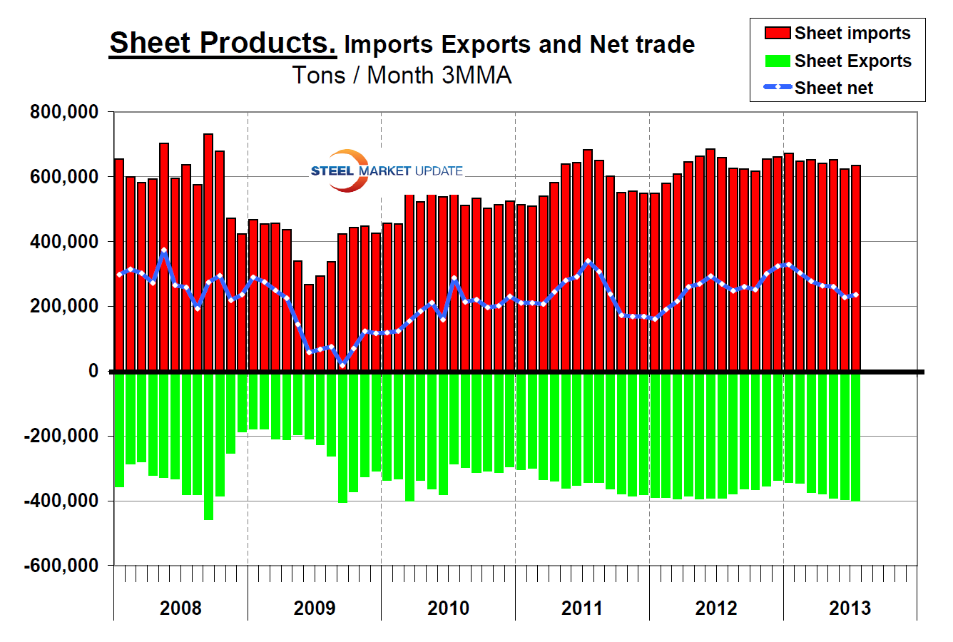 Table 1 compares the periods May through July and YTD for 2013 and 2012. Electro galvanized is the only product to have consistently had negative net imports, meaning that exports exceeded imports.