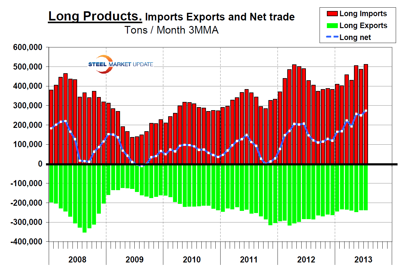 Year to date through July, net imports of steel sheet products have been steadily declining as those of long products have been steadily increasing, (Figures 1 and 2). Net imports are defined as imports minus exports and at times can be negative for individual products when exports exceed imports. In the case of flat rolled steel sheet products net imports in 2013 year to date compared to 2012 are up but on a monthly basis the change during the course of 2013 has been a steady improvement as steel imports declined and steel exports increased. In the case of long products, imports surged in the spring and early summer of both 2012 and 2013 and through July 2013 have yet to decline. During the course of 2013 net long product imports have risen.