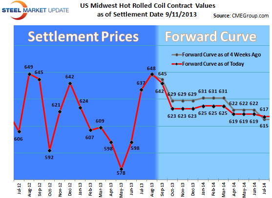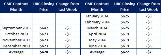 A very quiet week in steel, continuing a period of very quiet for some weeks now. A total of 250 contracts or 5000 ST traded. The market has come under some pressure as sellers have lowered offer levels and reached to some buyers levels. Q2’14 has been the biggest mover down from $625/ST to $617/ST, and Q4 ’13 also under pressure moving down to $623/ST from a $630/ST level. Q1 ’14 has also gone from $635/ST trading to $629/ST offered. The CRU number posted yesterday came in $646/ST down another $2/ST from the week prior. This leaves the market a long way from price levels that will encourage buyer interest, and thus transactions on futures. Rumblings abound in the spot market of deals being offered, but nothing tangible enough, as yet, to affect the index, or to even encourage trades on futures in anticipation.
