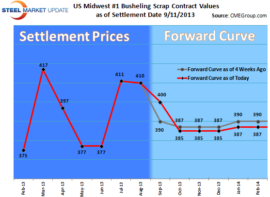 On the export front, the market is quiet as demand from Turkish mills is non-existent for now. Their demand picture is not good with turmoil in Egypt and Syria causing disruptions in various markets in MENA. Scrap inventories by some had also been built up in anticipation of better demand that didn’t materialize. The CFR index is now down to $368/MT. There continues to be no real bid interest on the futures contract. The situation for the world scrap market is not expected to improve as these demand factors prevail, Russia supply is likely to increase, and currency rates keep buying channels localized.
