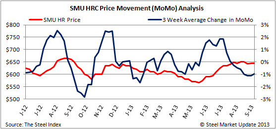 The change in MoMo can be a useful indicator in depicting the severity of price movements. Looking at the change on a 3-week moving average, we see that trend in HRC price movement fluctuation has begun to flatten out over the past 3 weeks. The 3-week average change in MoMo is -0.97 percent, a slight increase for the 2nd week in a row after 10 weeks of consecutive declines. The graph below demonstrates the relationship between the SMU hot rolled coil price and the three week moving average change in MoMo. Our HRC price range for this week is unchanged at $630- $660/ton with an average price of $645/ton.