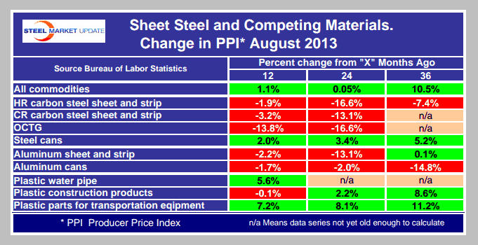Each month the Bureau of Labor Statistics puts out its series of producer price indexes, for thousands of goods and materials. The latest release on Friday reported August results. These statistics are a useful way to evaluate any changes in the competitive position of steel against competing materials. For the purpose of this report, Steel Market Update extracts comparative statistics for sheet steel, aluminum and plastic products. The headline on Friday was that the composite PPI rose 0.3 percent in August, after being flat in July and advancing in May and June. Finished energy goods and food prices drove the August headline index higher despite continued weakness in core goods prices.